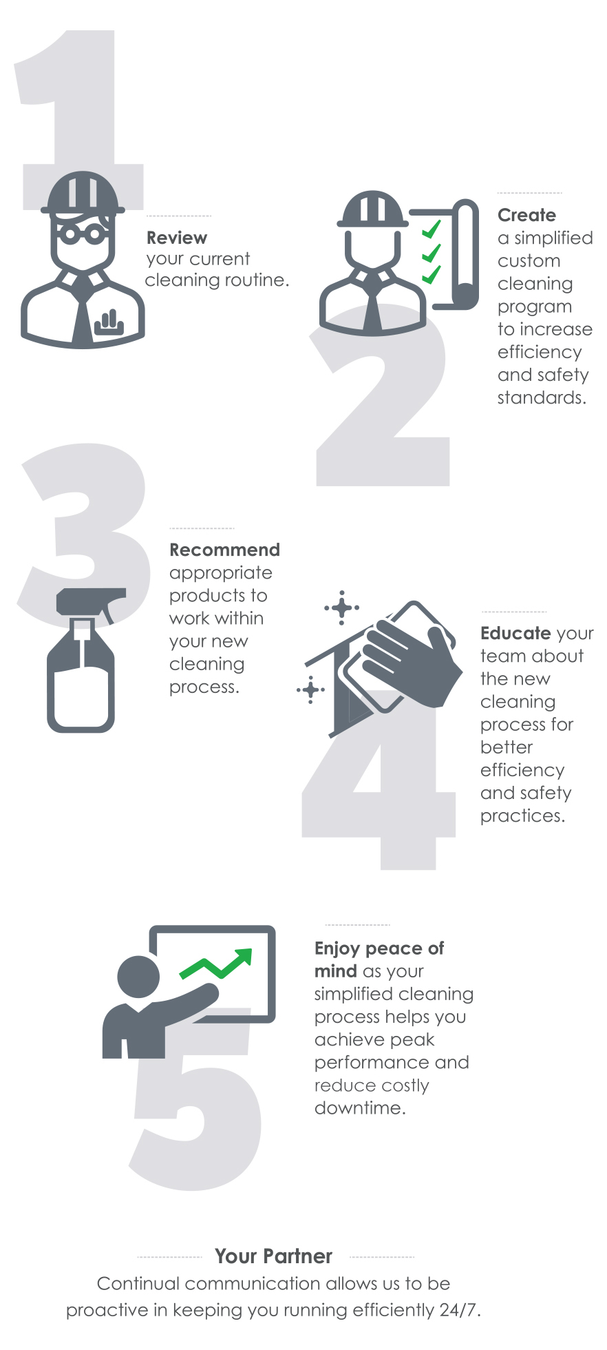 With your custom cleaning program, you’ll receive continued process support, product recommendations based on your industry, and safety education for your team. You can count on us to be dedicated process cleaning experts, so that you don’t have to be. Monitoring performance. Improving efficiency. Preventing downtime.
